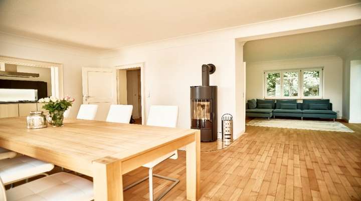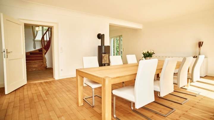 Im Erdgeschoss befindet sich eine Diele mit Gäste-WC und ein großzügiger Wohn-/ Essbereich mit einer modernen Einbauküche und einem Holzofen.