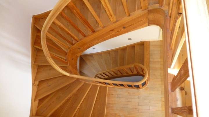 Die stilvolle, über insgesamt acht Monate hinweg restaurierte Original-Holztreppe, verbindet das Erdgeschoss mit den oberen zwei Geschossen.