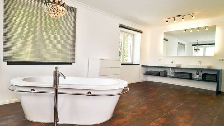 Im 1. OG befinden sich drei große Wohn- / Schlafräume mit Seesicht und Terrassenzugang sowie ein großes Badezimmer mit Fußbodenheizung, freistehender Badewanne und Dusche.