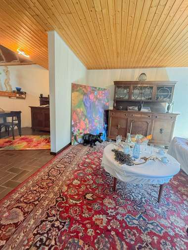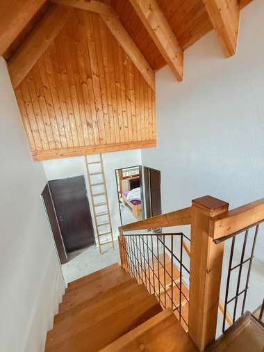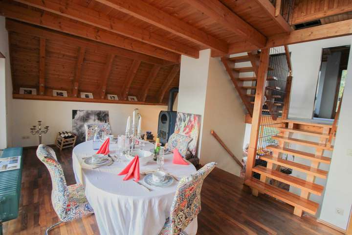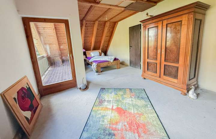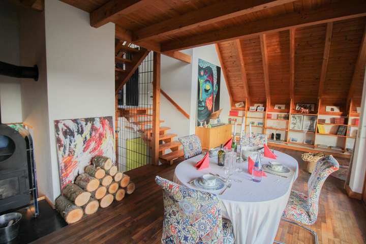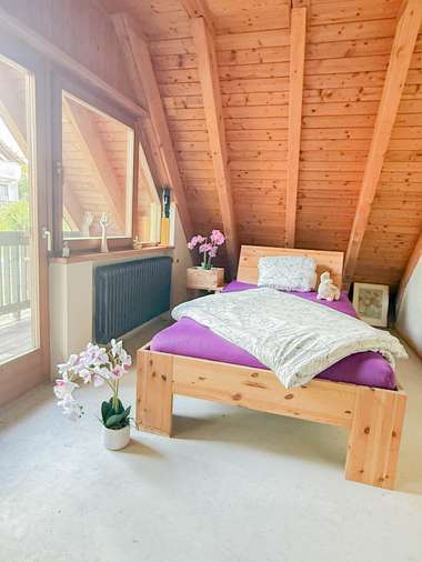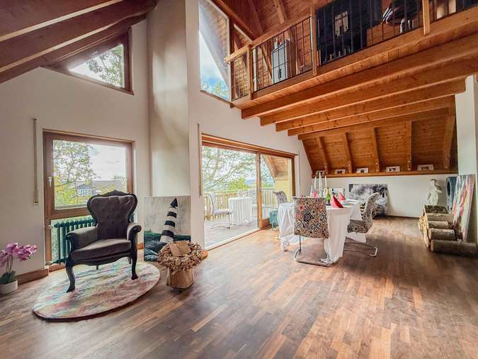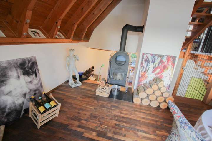 Der offene Wohnraum mit über fünf Meter hohem Giebel, sichtbaren Gebälk und großzügiger Fensterfront, bieten Ihnen den ganzen Tag viel natürliches Licht. Die Schiebefenster lassen sich zu 50% öffnen, so entsteht ein fließender Übergang nach außen, zum großen Balkon auf der Südseite.