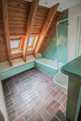 Das erste Schlafzimmer im DG verfügt im Norden über einen Balkon mit zwei Türen. Der großzügige Raum ist zum einen teilbar und kann im Dachspitz zusätzlich um 4,65 x 3,55 Meter (Grundfläche) erweitert werden. Auf dieser Ebene befindet sich das erste Badezimmer mit Dusche, Badewanne und ein separates WC.