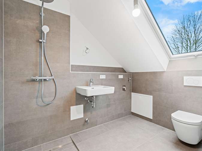Die großzügige Wohnfläche erstreckt sich über den offen gestalteten Wohn-, Ess- und Kochbereich im GG. mit Terrasse, über sieben Zimmer im EG. und DG.. Auf jeder Etage befindet sich ein Tageslichtbad.