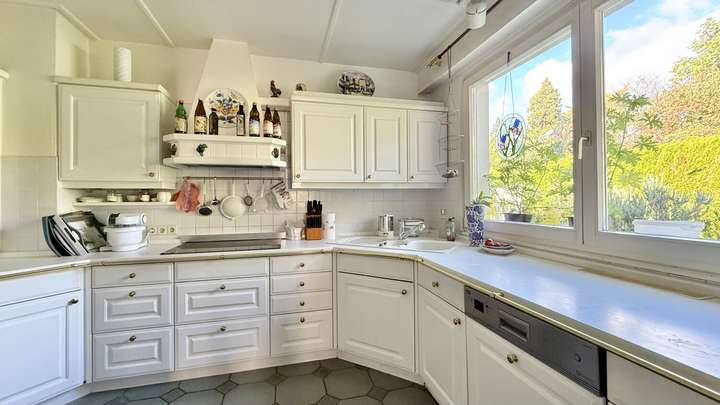 Die vorhandenen drei Badezimmer bieten Komfort im Alltag und sorgen auch bei einer größeren Familienkonstellation für ausreichend Privatsphäre. Ein geräumiger Wohn- und Essbereich bildet das Zentrum des Hauses und überzeugt durch viel Tageslicht sowie einen stimmigen Übergang zur angrenzenden überdachten Sonnenterrasse. Hier finden Sie genügend Platz, um gemeinsame Mahlzeiten zuzubereiten oder gesellige Stunden im Kreis der Familie zu verbringen.