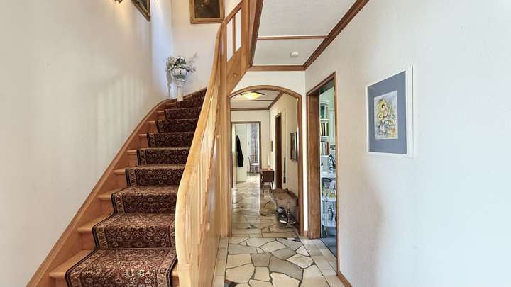 Durch die vorteilhafte Aufteilung ist sowohl das Erdgeschoss als auch das Obergeschoss optimal genutzt: Während sich im Erdgeschoss neben dem großzügigen Wohnzimmer, einem großen Esszimmer und der Küche, auch ein Schlafzimmer sowie ein Badezimmer befinden, sind die weiteren vier Schlafzimmer und zwei Bäder im Obergeschoss angeordnet. Zusätzlicher Stauraum ist durch den Keller vorhanden, in dem sich auch die Heizungsanlage befindet. Die zentrale Öl-Heizung sorgt für gleichmäßige Wärme in allen Räumen; die Ausstattung ist funktional und entspricht dem Standard einer gepflegten Immobilie dieser Bauzeit.