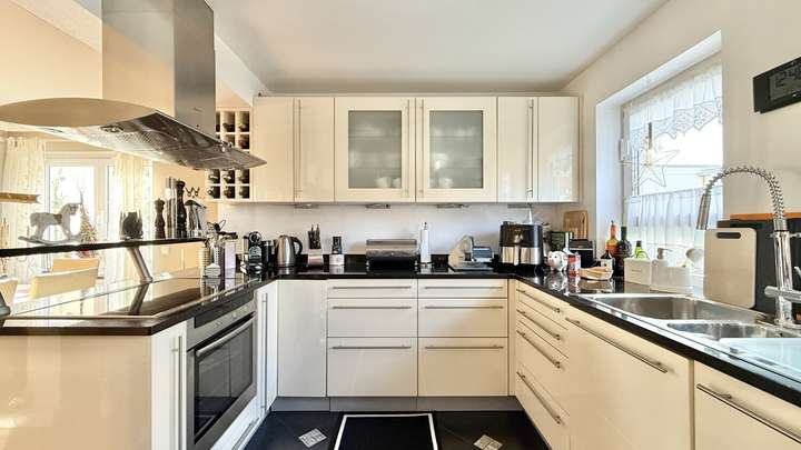 Herzstück der Immobilie sind die hellen, offen gestalteten Wohn- und Essbereiche. Teils bodentiefe Fenster lassen viel Tageslicht herein und bieten einen schönen Ausblick in den gepflegten Garten. Die Ausstattung ist durchgehend als von gehobener Qualität zu bezeichnen. Hochwertige Bodenbeläge (2006), solide Türen sowie eine stilvolle Treppenanlage unterstreichen den wertigen Gesamteindruck. Die moderne Küche (2006) überzeugt durch ihre Raumaufteilung und Funktionalität; hier findet die Familie ebenso Platz für das gemeinsame Kochen wie Gäste für gesellige Abende.