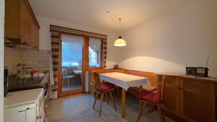 Im Erdgeschoss befinden sich ein Wohnzimmer, ein separates Esszimmer, ein Schlafzimmer sowie eine Küche mit integrierter Sitzecke. Von der Küche aus besteht Zugang zu einem geschlossenen Balkon. Ergänzt wird diese Ebene durch ein Badezimmer mit Badewanne und Dusche.