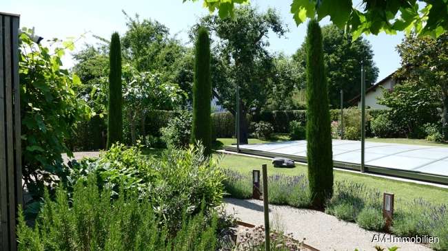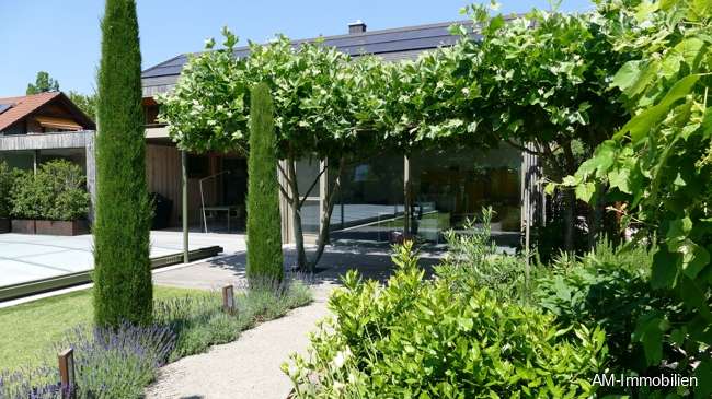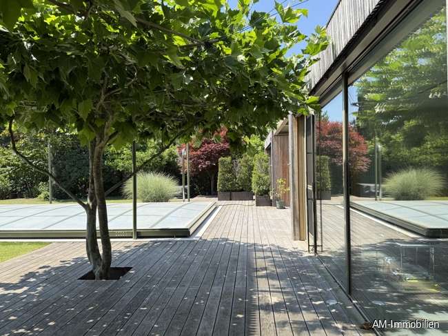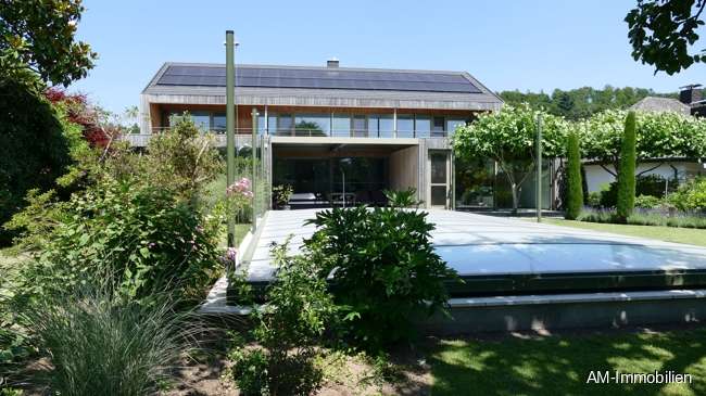 Das neuwertige Einfamilienhaus besticht durch großflächige Glasfronten und liegt auf einem 1.077 qm großen Grundstück, das professionell durch einen Gartenarchitekten gestaltet wurde.