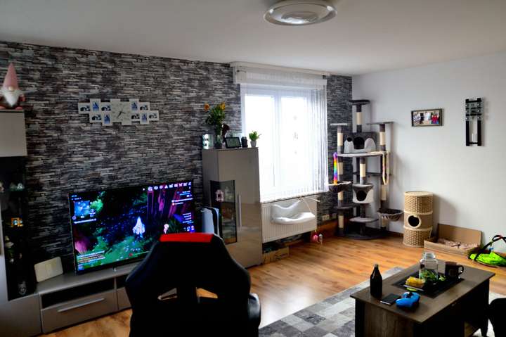 Die Obergeschosswohnung verfügt ebenfalls über ca. 82 Quadratmeter Wohnfläche und ist mit einem Balkon ausgestattet. Diese Einheit ist derzeit vermietet und bietet damit eine solide Grundlage für laufende Mieteinnahmen. Auch hier sorgt der gut geschnittene Grundriss für eine angenehme Wohnqualität.